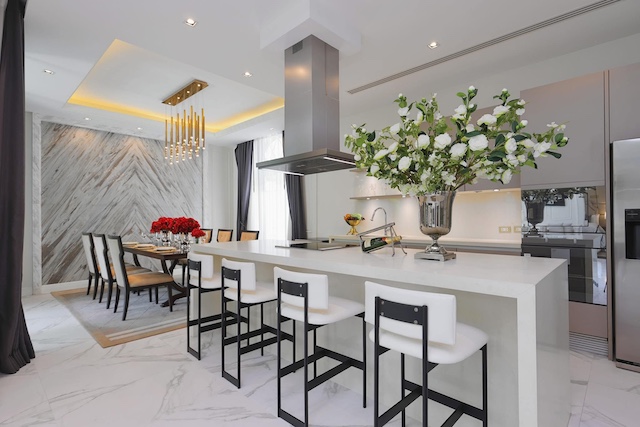 ครัวนำเข้าจากเยอรมัน Poggenpohl พร้อมเครื่องใช้ไฟฟ้า Gorenje by Philippe Starck ได้แก่ เครื่องล้างจาน เตา เครื่องดูดควัน ไมโครเวฟ และเตาอบ