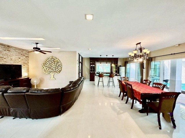 ห้องนั่งเล่นและห้องทานอาหารแบบเปิดโล่ง เชื่อมต่อระเบียงสระน้ำ