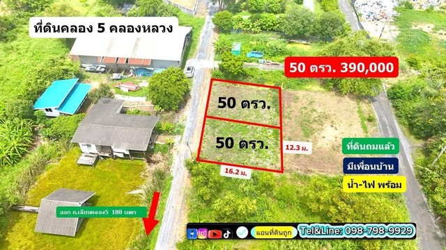 ที่ดิน คลอง5 คลองหลวง ซอย 68 ตะวันออก 50 ตรว. 390,000 ถมแล้ว น้ำ-ไฟ