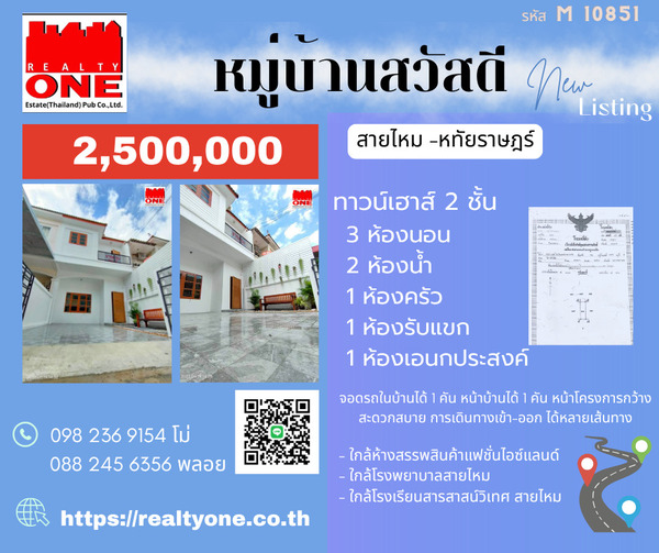 Quote from Realtyone3 Realtyone3 on 03/10/2025, 8:24 pmขาย – *****ทาวน์เฮ้าส์ 2 ชั้นมือสองปทุมธานี หมู่บ้าน สวัสดี สายไหม-หทัยราษฎร์ เนื้อที่กว้าง 20 ตร.ว. บ้านต่อเติมครบครัน บนทำเลดี เชื่อมต่อถนนหทัยราษฎร์, ถนนลำลูกกา ใกล้รถไฟฟ้าสายสีเขียว ”สถานีคูคต” และจุดขึ้นทางด่วน ”รามอินทรา-อาจณรงค์” ในราคาสุดคุ้ม!