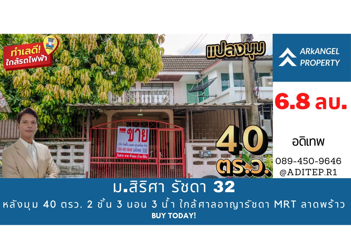 ทาวน์เฮ้าส์หลังใหญ่ 40 ตรว. หมู่บ้านสิริศา รัชดา 32 ซอยตรงข้ามศาลอาญารัชดา ใกล้ MRT ลาดพร้าว หลังมุม 3 ห้องนอน 3 ห้องน้ำ