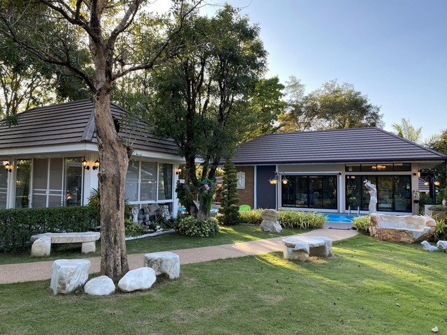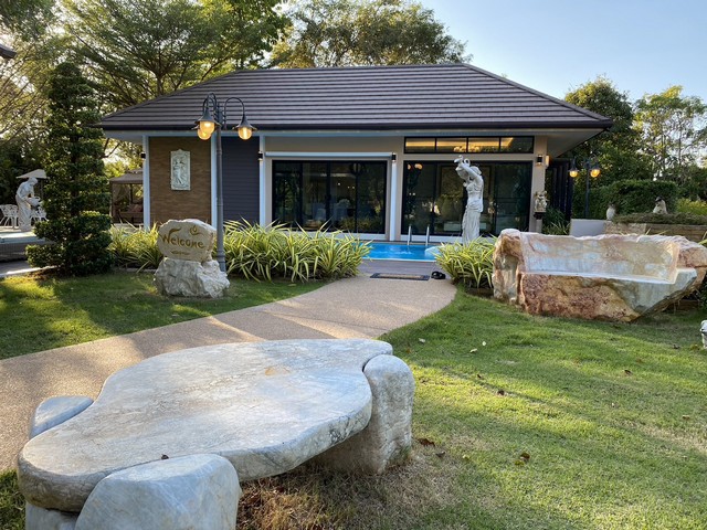 บ้าน 3 หลังมีห้องน้ำทุกหลังและมีห้องอาบน้ำข้างสระว่ายน้ำและห้องน้ำคนสวนและมีศาลาอยู่ข้างบ้านขนาด4คูณ8เมตร