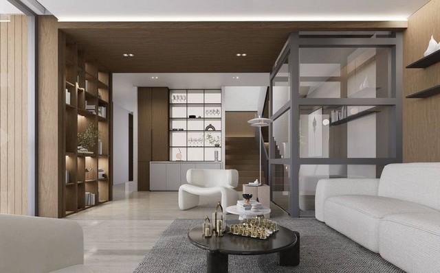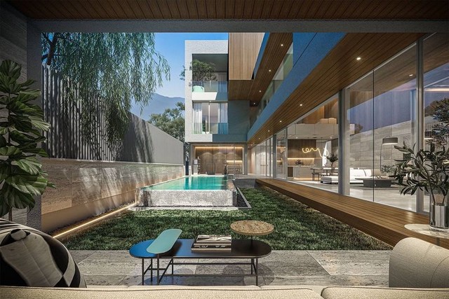 * ห้องรับแขก ห้องอาหาร และ ครัวฝรั่ง บนพื้นที่เปิดกว้าง เห็นวิวสระน้ำได้ชัดเจน
