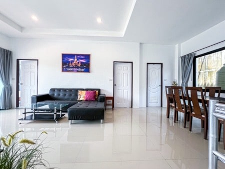ห้องนั่งเล่นกว้าง ครัวและอุปกรณ์ครบ