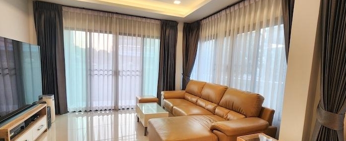 - ห้องนั่งเล่น กว้างขวาง สามารถวางโซฟาชุดใหญ่ได้ พร้อมทั้งเปิดรับแสงธรรมชาติด้วยประตูและหน้าต่างกระจกเข้ามุมขนาดใหญ่ ทำให้รู้สึกโปร่ง โล่ง สบาย