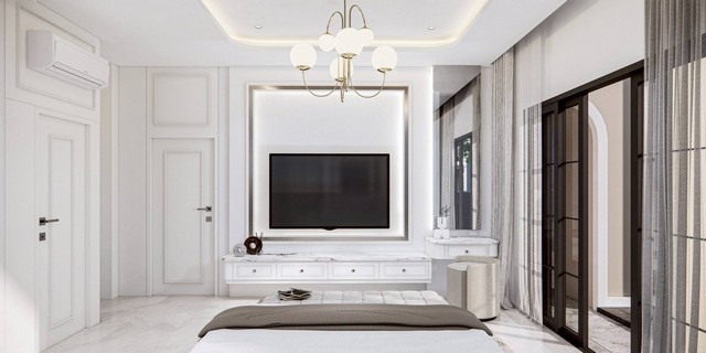 บ้านเดี่ยวชั้นเดียว สไตล์โมเดิร์นคลาสสิก (Modern Classic ) ฝ้าเพดานโปร่งโล่ง ขนาดที่ดิน 76 ตารางวา 3 ห้องนอน 4 ห้องน้ำ