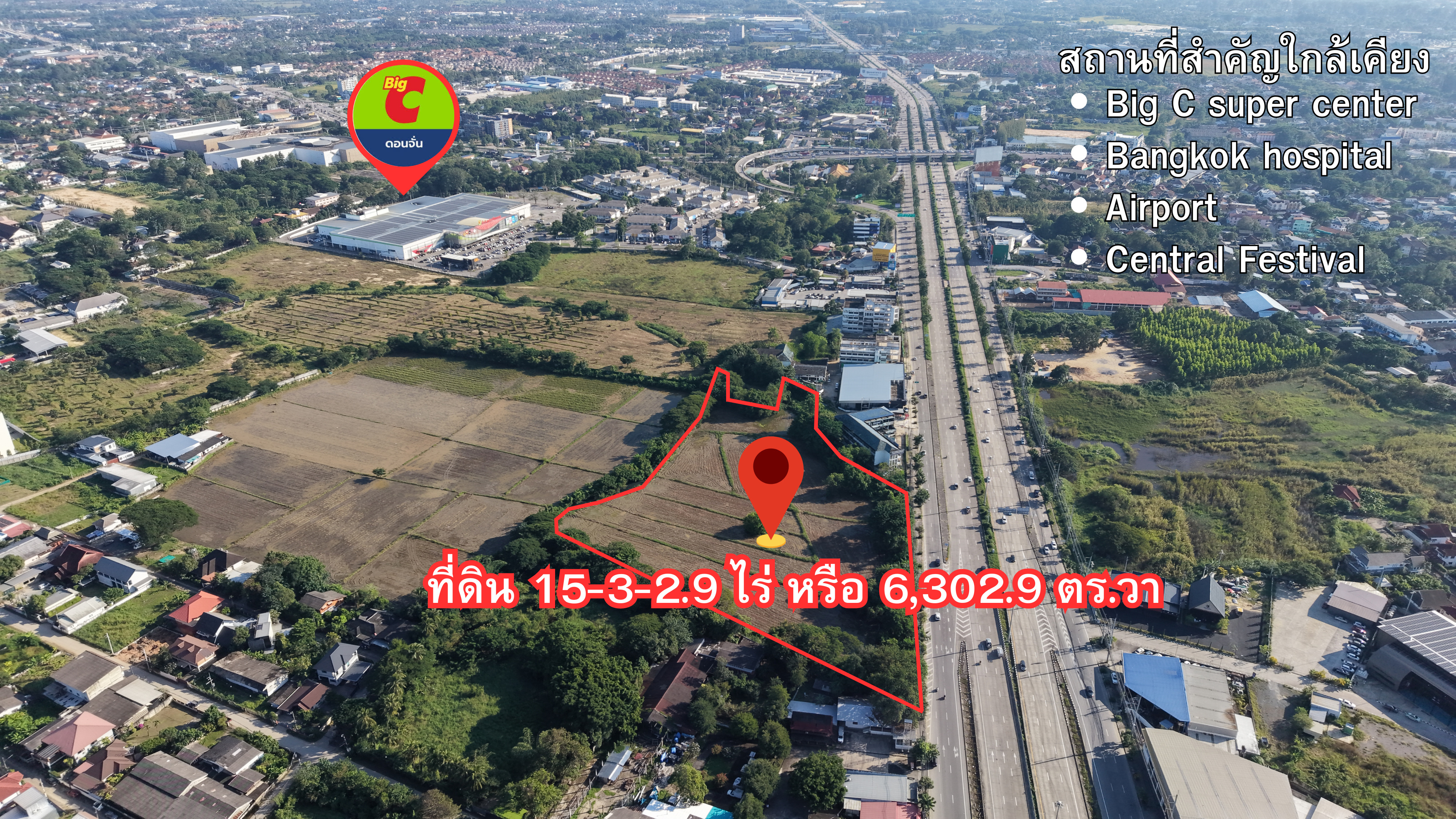 ขนาดที่ดิน : 15 ไร่ 3 งาน 2.9 ตารางวา (6,302.9 ตารางวา หรือ 25,211.6 ตารางเมตร )