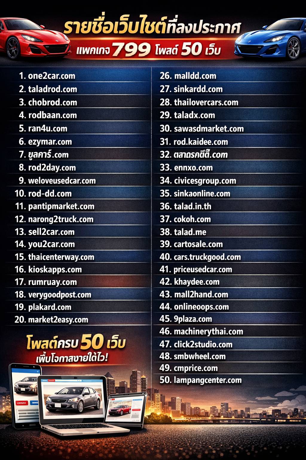 • โพสต์ 50 เว็บรถชั้นนำ เช่น one2car.com, chobrod.com, taladrod.com ฯลฯ