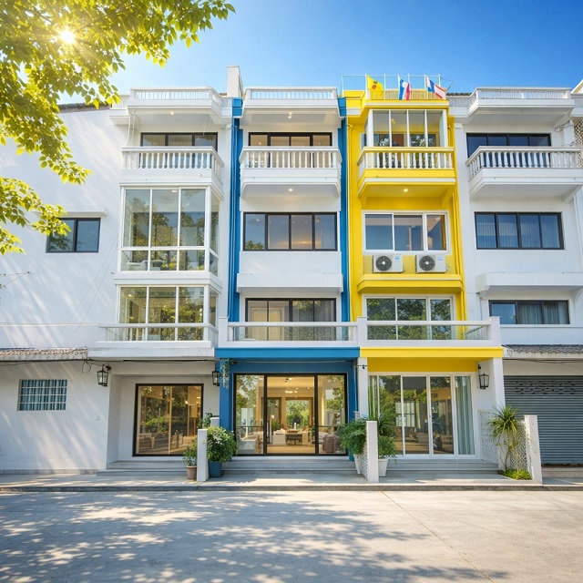 ตึกแถว 3 ชั้นดาดฟ้า ขนาด 18 ตารางวา มีชั้นลอย หน้ากว้าง 4 เมตร ลึก 18 เมตร 2 ห้องนอน 2 ห้องน้ำ มีพื้นที่ด้านหลัง ภายในกั้นห้องเรียบร้อย ติดแอร์ ประตูกระจกบานเลื่อน พื้นที่ใช้สอยเหมาะทั้งอยู่อาศัยและทำการค้า ทำเลหน้าซอยมีห้างขนาดใหญ่ การเข้าออกสะดวก ใกล้ถนนหลักและทางด่วน