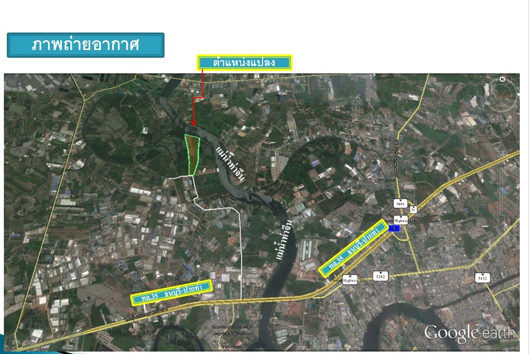 แปลงที่ดินเป็นรูปสี่เหลี่ยมด้านไม่เท่า โดยหน้าติดถนน ทล.2013 กว้าง 82 m ด้านข้างยาวจนถึงแม่น้ำท่าจีน 960 m ด้านหลังติดแม่น้ำท่าจีน กว่า 320 m ในแปลงไม่มีทางสาธารณะหรือคลองน้ำตัดผ่านพื้นที่ผืนเดียวติดต่อกัน ที่ดินได้รับการปรับถมแล้ว 90% ของพื้นที่ (สูงกว่าระดับถนน 20 cm ) และที่ดินดังกล่าว ติดกับเขตอุตสหกรรมสมุทรสาคร และเป็นพื้นที่สีตามผังเมืองคือสีชมพู