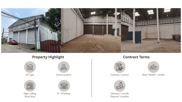 - การใช้ประโยชน์อื่นๆ ที่ต้องการเพดานสูง หรือพื้นหนารับน้ำหนักได้สูงราคาเช่า 110,000 บาท / เดือน ( ชำระล่วงหน้า 1 เดือน ประกัน 3 เดือน สัญญาครั้งละ 3 ปี )