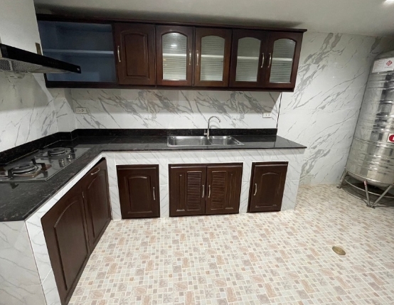 -สิ่งอำนวยความสะดวกภายในบ้าน -เฟอร์นิเจอร์บิวท์อินชุดเคาเตอร์ครัวพร้อมซิงค์ชั้นล่างเตาแก็ส 2หัว และฮู้ดดูดควัน