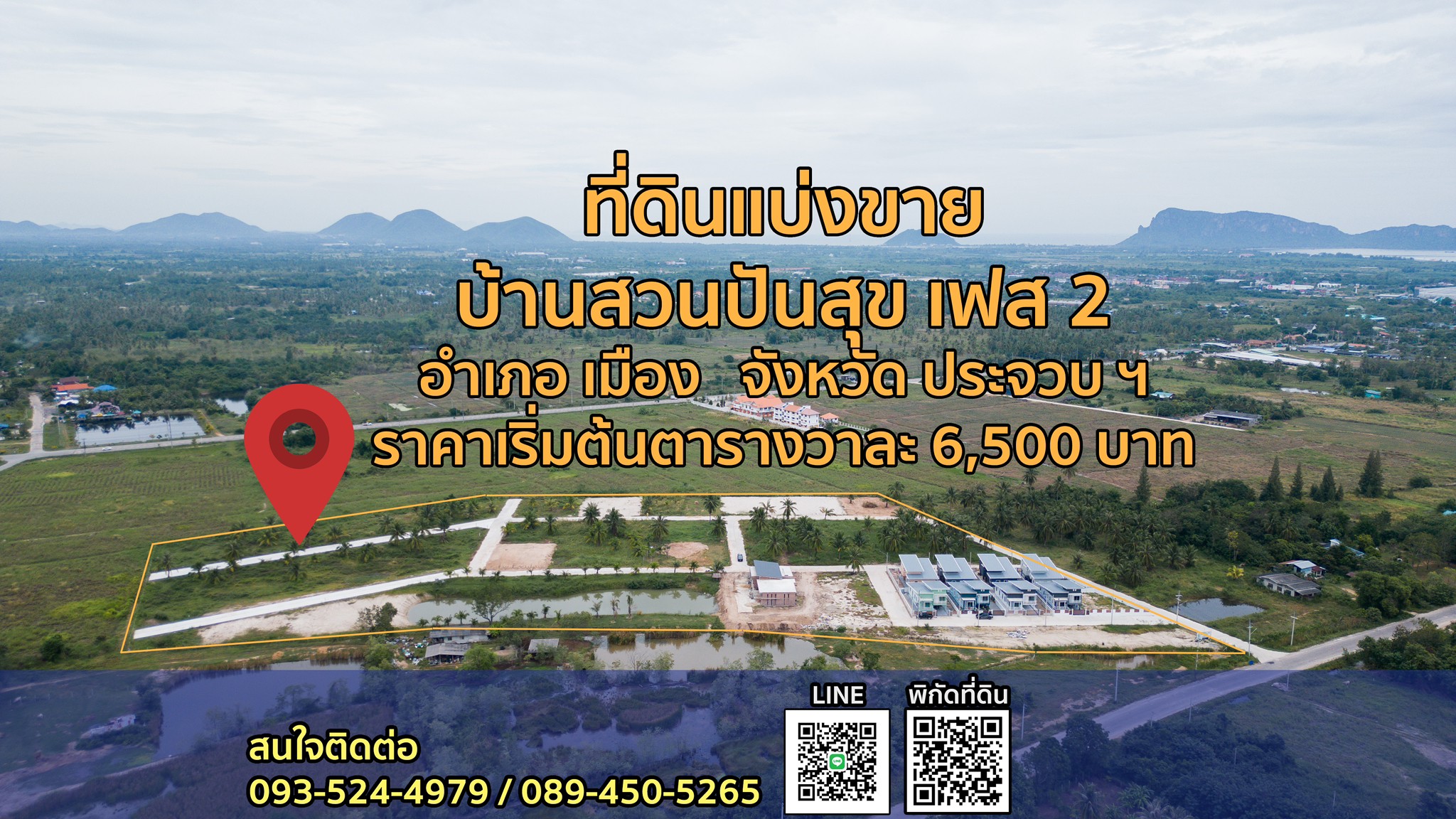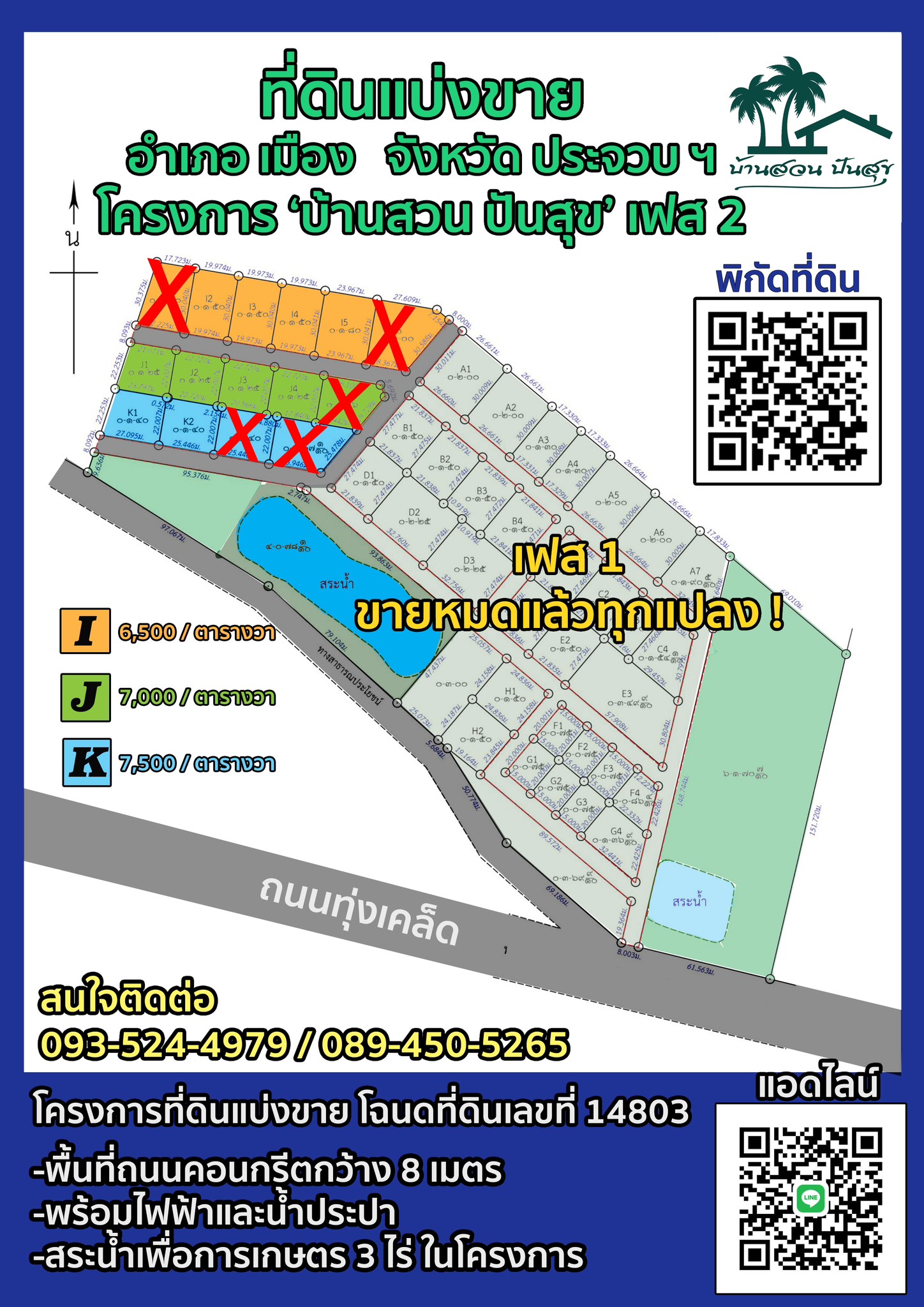 เพียง 2 กม. จากสี่แยกประจวบพร้อมสาธารณูปโภคครบครัน:ถนนคอนกรีตกว้าง 8 เมตรน้ำประปาส่วนภูมิภาคไฟฟ้าครบทุกแปลงสระน้ำเพื่อการเกษตร 4 ไร่เงื่อนไขการชำระเงิน: