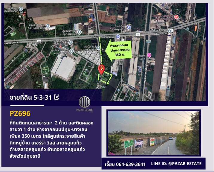 2 ด้าน และติดคลองสามวา 1 ด้าน ห่างจากถนนปทุม-บางเลนถนนสาย 346 เพียง 350 เมตร ใกล้ศูนย์กระจายสินค้า ติดหมู่บ้าน เทอร์ร่า วิลล์ ลาดหลุมแก้ว ตำบลลาดหลุมแก้ว อำเภอลาดหลุมแก้ว จังหวัดปทุมธานีราคา 23,076,900 บาท