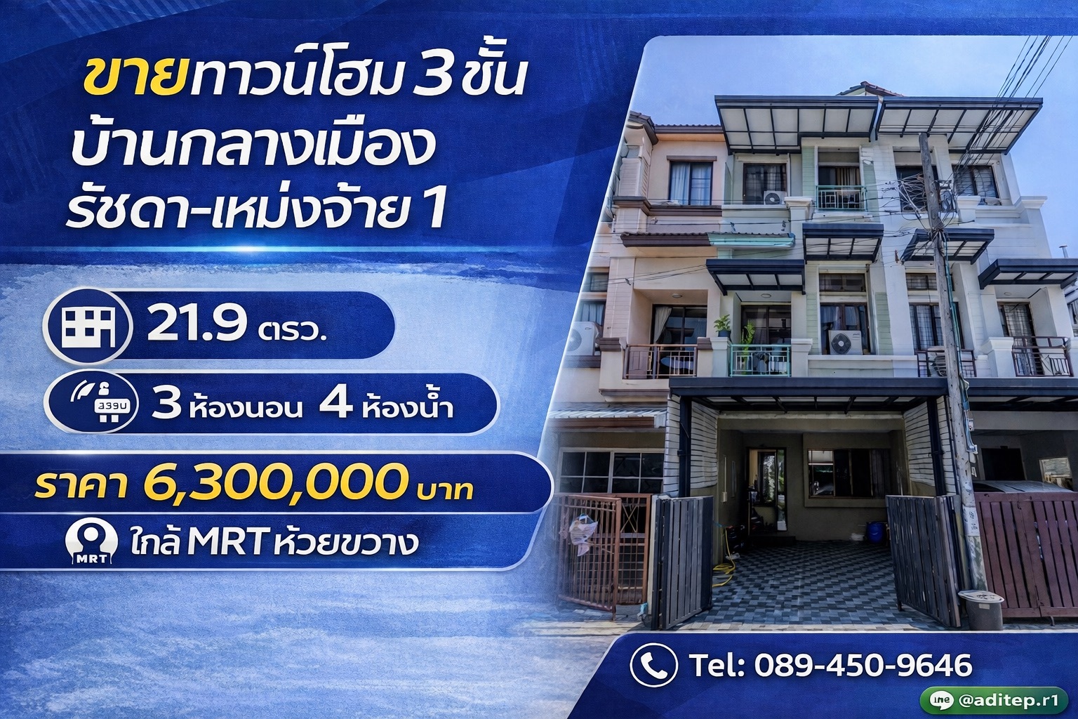 Quote from อดิเทพ ภระมรทัต on 20/02/2026, 5:08 amขายทาวน์โฮม 3 ชั้น บ้านกลางเมือง รัชดา-เหม่งจ๋าย 1 ขนาด 21.9 ตรว. 3 ห้องนอน 4 ห้องน้ำ ทำเลใจกลางเมือง ใกล้ MRT เหมาะทั้งอยู่อาศัย ลงทุนปล่อยเช่า หรือเปิดโฮมออฟฟิศ