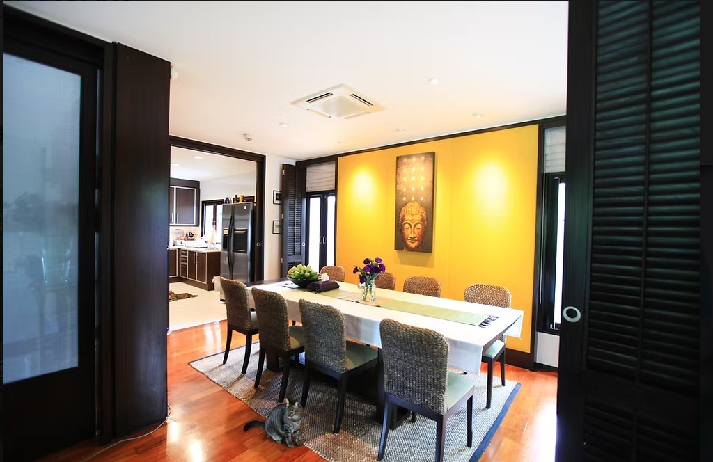 位于 Mooban Noblewana Watcharapol 内,这栋维护精美的两层住宅处于曼谷最令人向往的封闭式社区之一,完美融合了奢华、舒适与私密。定制设计的室内装潢以优雅的深色木质饰面为主,拥有4间宽敞的卧室、4间浴室、一间独立办公室以及一间宽敞的独立佣人房。