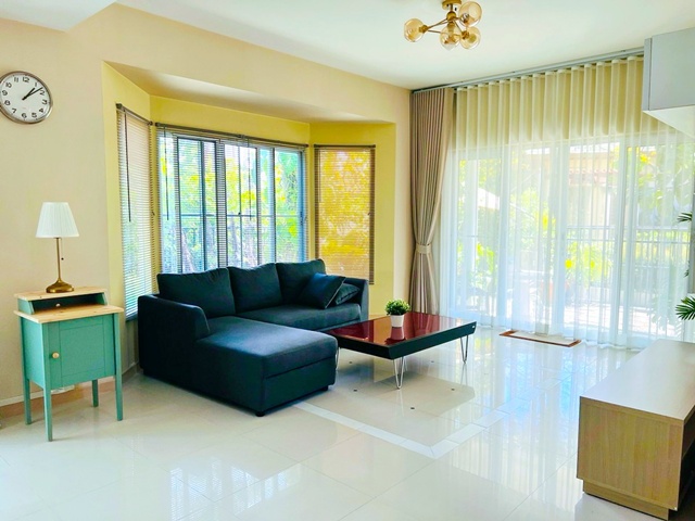 พื้นที่ 54 ตร.ว. พื้นที่ใช้สอย 160 ตร.ม. จอดรถในบ้านได้ 2 คัน มีสนามหญ้าข้างบ้านติดสวน เหมาะเป็นมุมพักผ่อน บรรยากาศร่มรื่นด้วยต้นไม้ใหญ่