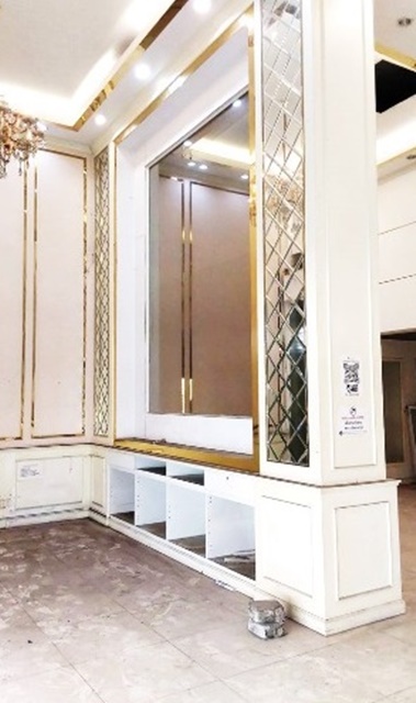 ตกแต่งบิวด์อินบางส่วนสไตล์หรู โทนสีขาวทอง ดูสะอาดและทันสมัย เหมาะสำหรับธุรกิจที่ต้องการภาพลักษณ์ระดับพรีเมียม