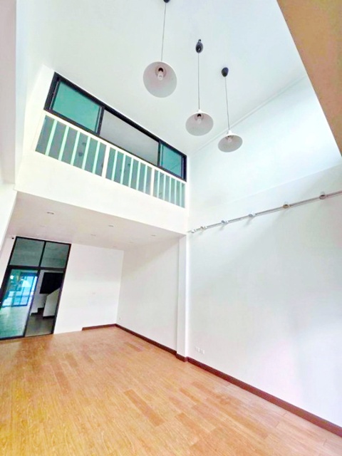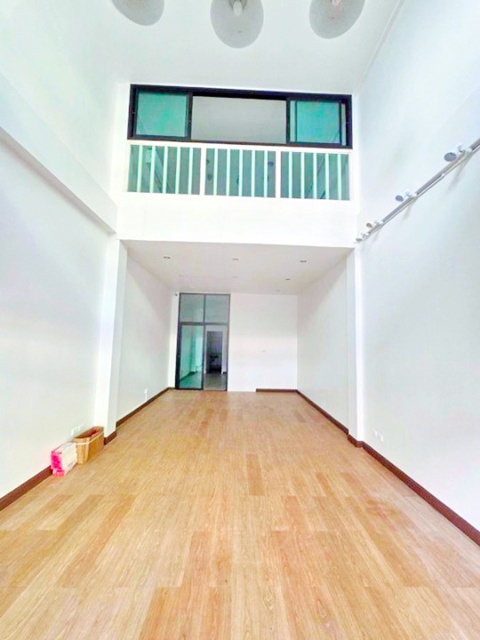 ชั้นล่างเป็นโถงกว้าง พื้นที่โล่ง เพดานสูง โปร่งสบาย ต่อเติมพื้นที่ด้านหลังเต็ม สามารถใช้งานได้จริง เหมาะทำพื้นที่ทำงานหรือโชว์รูม