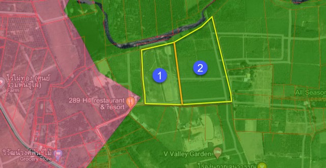 2) ที่ดินติดถนน: หน้ากว้าง 419 เมตร ลึก 350 เมตร (ถนน 10.5 ม. และด้านหลังติดห้วยแม่ประจัน)
