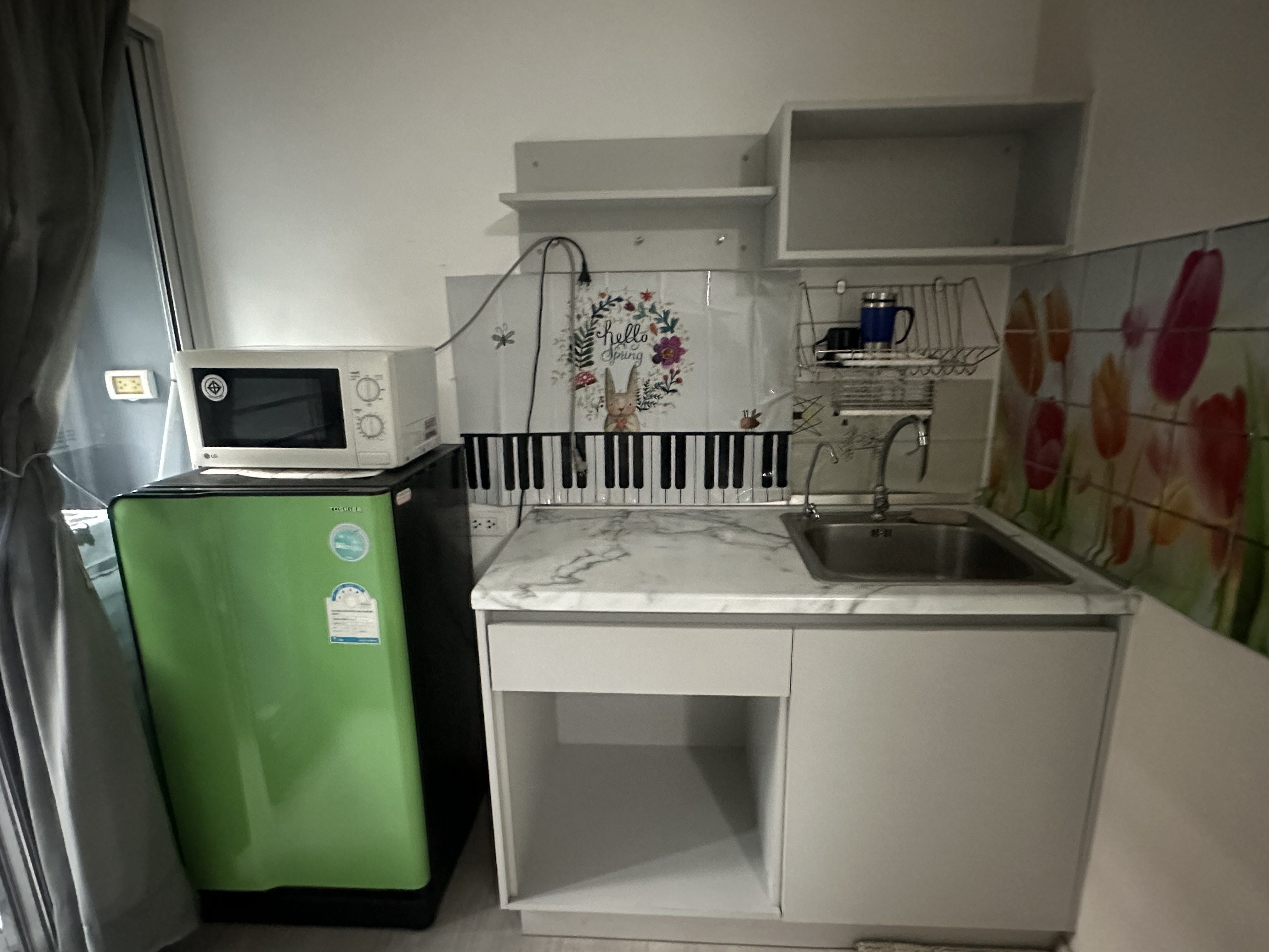 - เคาเตอร์ครัวมีตู้เก็บของทั้งข้างบนและล่าง /ไมโครเวฟ/เครื่องกรองน้ำ/ตู้เย็น /โต๊ะทานข้าว2ที่นั่ง
