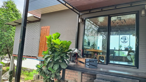 3.ร้านกาแฟ ขนาด 60 sqm. ตบแต่งด้วยไม้ โคมไฟแนววินเทจ บรรยากาศทุ่งนาติดธรรมชาติ แถมโต๊ะ เก้าอี้ ทั้งหมดภายในร้าน แอร์ 2 เครื่องแปลงเกษตรและโรงเรือนเลี้ยงวัว ด้านหลัง