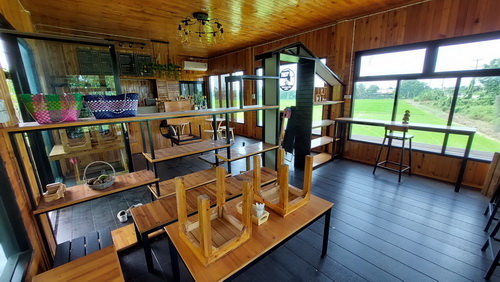 3. Coffee shop, size 60 sqm. decorated with wood vintage style lamp Atmosphere of rice field next to nature, plus tables and chairs, all inside the shop, 2 air conditioners