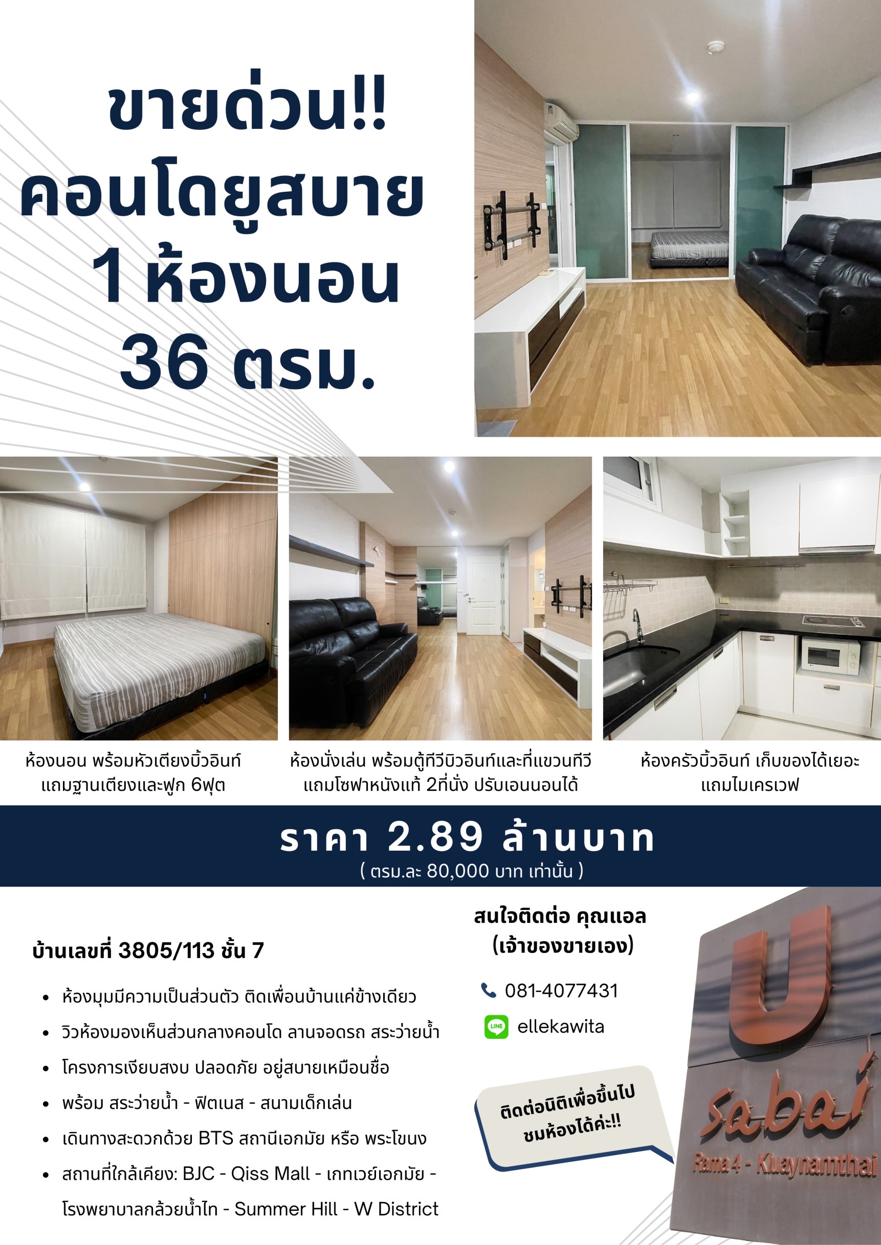 ขายด่วน 2.89ลบ คอนโดยูสบาย 1ห้องนอน 36ตรม เจ้าของขายเอง