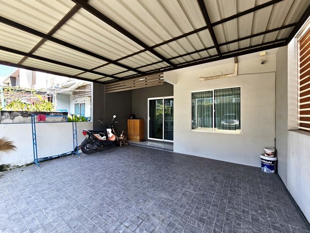 - หน้าบ้านต่อเติมหลังคาและปูพื้นที่จอดรถ สามารถจอดรถภายในบ้านได้ 2 คัน