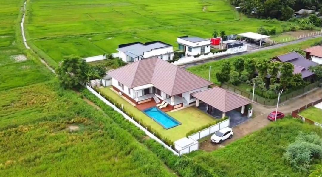 โซนดอยสะเก็ด ให้เช่า 70,000 บาท/เดือน ลดราคาขาย 8.9 ล้าน 188 ตรว. 4 นอน 4 น้ำ พูลวิลล่าชั้นเดียว ยกพื้นสูง วิวทุ่งนา วิวภูเขา 360°