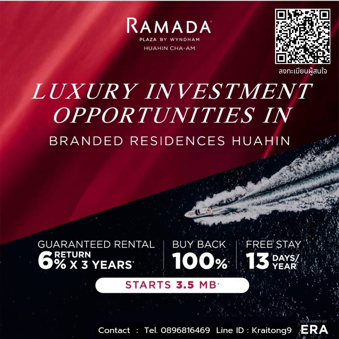คอนโดเพื่อการลงทุน บริหารงานเป็นโรงแรม ผลตอบแทน 6% ต่อปี นาน 3 ปี พักฟรี 13 คืนต่อปี รับซื้อคืน 100% RAMADA PLAZA BY WYNDHAM HUAHIN CHA-AM