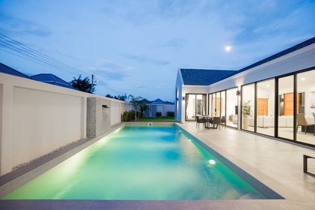 Prime location HuaHin Floating Market SamPhanNam 1.7km.Luxurious pool villa VanaNava Water Park Royal Park Rajapruek stunning 3bed 4bath fully furnished modern lifestyle HuaHin Hospital5 2.1 km.270 sq.m. 68 sq.wa. For sale 10.9 million baht private resort-style vacation home Suan Son Pradipat Beach 7.9 km.Private pool with stunning views
