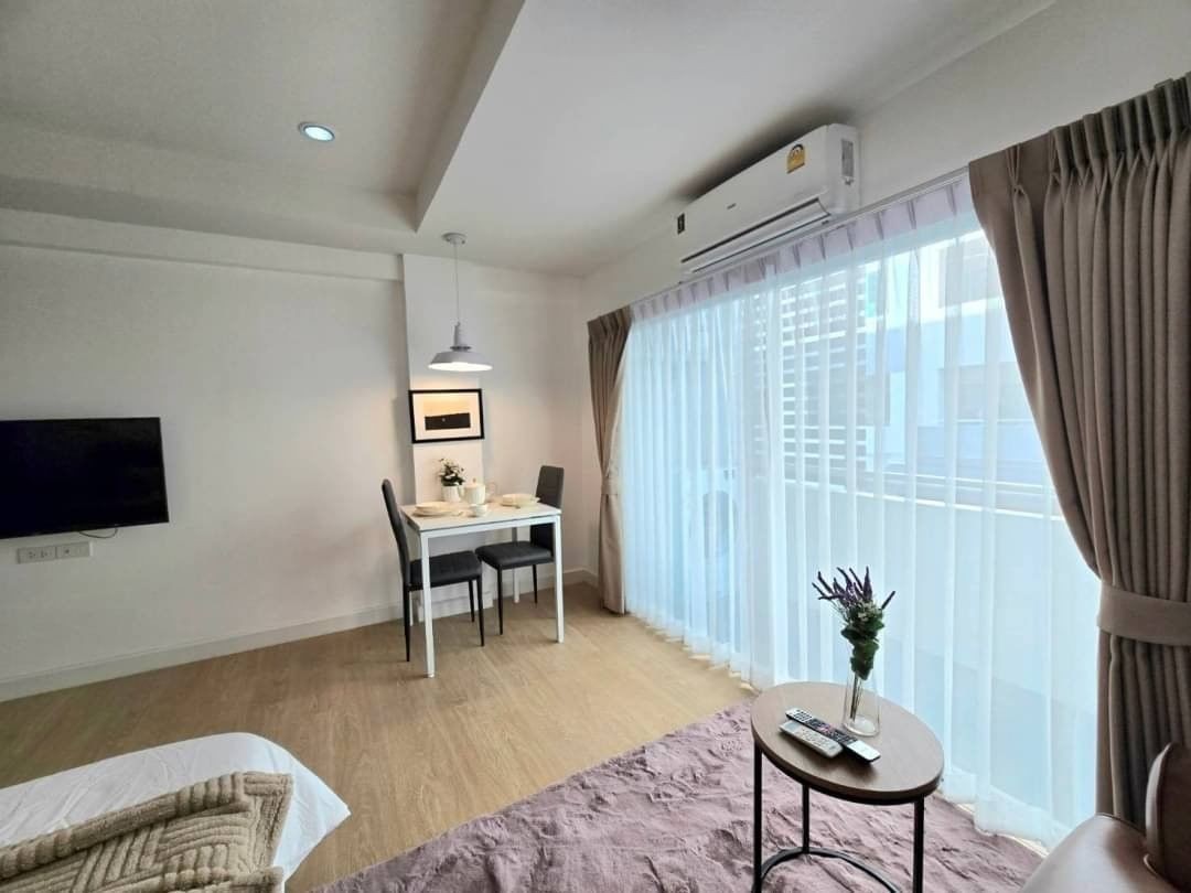 สตูดิโอ 1 ห้องน้ำมีโซนทานอาหารพร้อมชุดโต๊ะ 2 ที่นั่ง แยกโซนครัวพร้อมเคาท์เตอร์ครัวบิ้วอิน ห้องมีระเบียงอากาศถ่ายเทได้ดี ระเบียงกว้าง