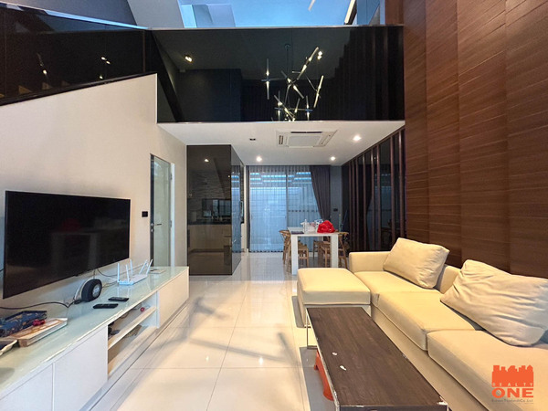 • ห้องนั่งเล่น – ชุดเฟอร์นิเจอร์Built-in (ผนัง, ตู้เก็บของ, ราวบันได Temper Glass), ประดับไฟ Chandelier และ ไฟ LED ติดเพดาน, ชุดโซฟา, แอร์ติดเพดาน Mitsubishi, TV