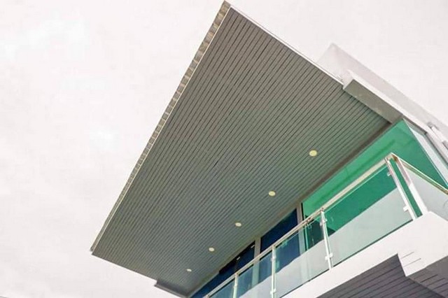 - บันไดยื่นจากผนังสไตล์โมเดิร์นหุ้มด้วยไม้สัก