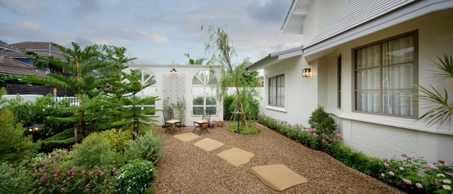 สวนบ้านนี้ออกแบบเพื่อดูแลง่าย ใช้กรวดแม่น้ำเป็นหลัก ข้อดีของสวนดูแลรักษาง่าย โดยองค์ประกอบต่างๆ ที่ลงตัว รูปทรงสถาปัตยกรรม ของบ้านที่สวย การตกแต่งสวนที่ลงตัวพร้อมกับการตกแต่งภายในที่สวยงามทำให้บ้าน หลังนี้ลงตัวสุดๆ