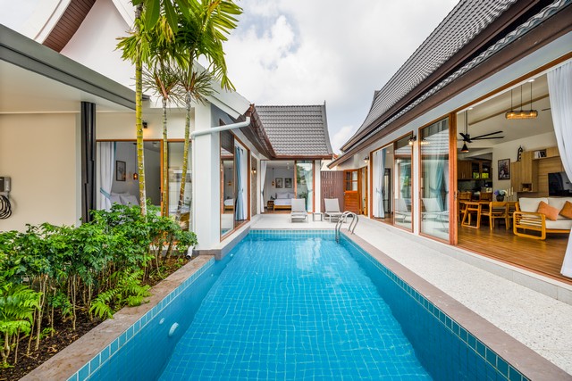 This Double Master Bedroom villa is designed with 3 separate L- L-shaped pavilions wrapped around a private swimming pool, All pavilions open out to the outdoor pool terrace, swimming pool & garden.