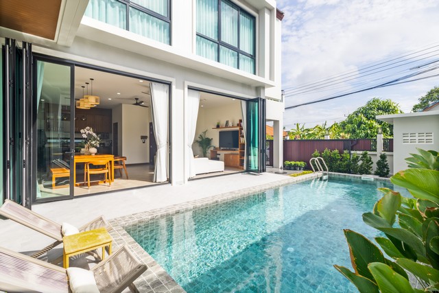 This Double Master Bedroom villa is designed with 3 separate L-shaped pavilions wrapped around a private swimming pool, All pavilions open out to the outdoor pool terrace, swimming pool & garden
