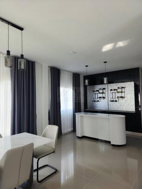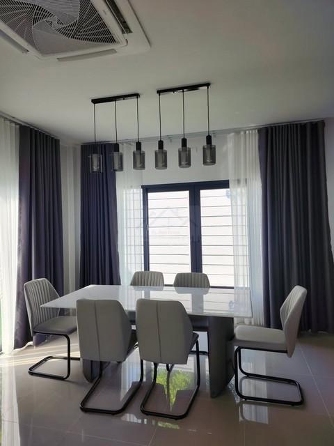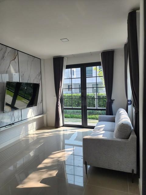 มีผ้าม่านทั้งหลัง หลังบ้านและหน้าบ้านมีหลังคา เฟอร์นิเจอร์จากแบรนด์ SBโครงการห่างจากเมกาบางนา เพียง 800 เมตร