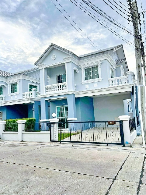 Huachiew Chalermprakiet Village 4.1 km. Wat Sriwarinoy Rd. APL Suvarnabhumi 5.3km. For rent 2-storey twin house new corner house 56sq.w. 230sq.m.18-19,999 B-M 3 bed 2 bath community area convenient for shopping Thipkasorn Market 1.8 km.Bangna-Trad Rd.Suvarnabhumi Airport