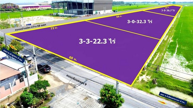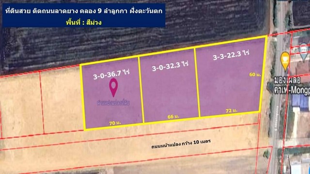 พื้นที่ : สีม่วง ถมแล้ว ติดถนนเลียบคลอง 9 ลำลูกกา