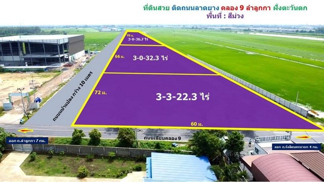พื้นที่สีม่วง ถมแล้ว ติดถนนเลียบคลอง 9 ลำลูกกา ที่ดินสวย ขนาด 3 ไร่