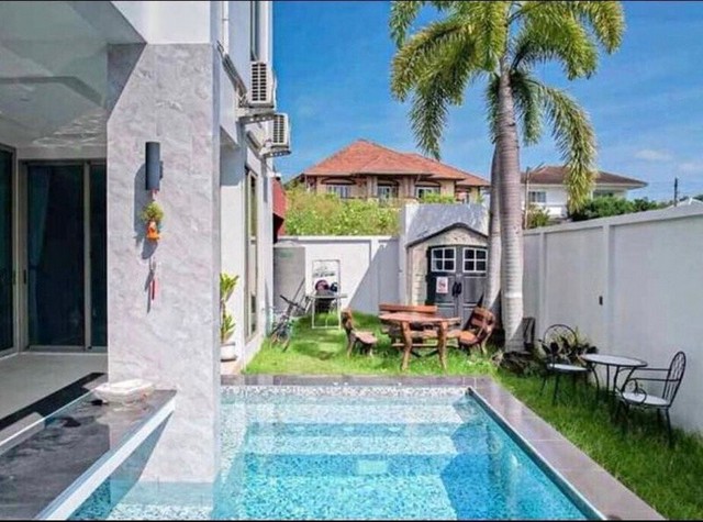 สวนส่วนตัวสีเขียว สระว่ายน้ำขนาด 4x8 เมตร สวนตกแต่งอย่างสวยงาม และที่จอดรถในร่มที่ปลอดภัย