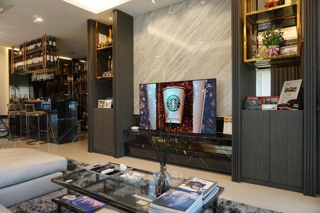 - ห้องนั่งเล่นโซฟาขนาดใหญ่ ( 2 แสนบาท ) พร้อมทีวี SONY OLED 65 นิ้ว ด้านหลังตกแต่งด้วยหินแท้ขนาดใหญ่แผ่นเดียวไม่มีรอยต่อ