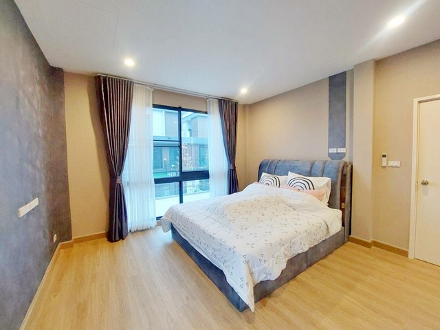 -ห้องนอนมาสเตอร์ตกแต่งโทนสีอบอุ่น ไฟสีวอร์มไลท์และพื้นspcลายไม้ เสริมบรรยากาศด้วยม่านกันแดด พร้อม Walk-in Closet