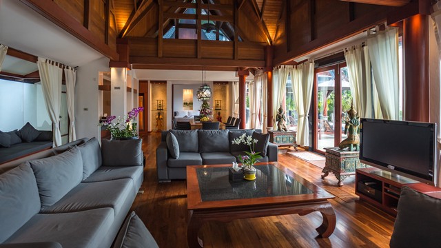 Upper Level: The entire upper level has a sweeping sea view. It comprises a large elegant living and dining area, a kitchen and two master bedrooms. All rooms have high vaulted ceiling in teak which provides a real impression of grandeur, tall glass doors and windows open to the infinity-edge pool. Set on either side of the swimming pool are open Thai salas for outdoor relaxing and breathtaking views of the Andaman Sea and its famous sun set of Phuket’s West Coast. All the upper level is tastefully decorated with Asian art from Thailand, Myanmar, Cambodia, Laos and India.Lower Level : The lower level comprises three beautifully decorated bedrooms with en-suite bathrooms. There is also Maid’s quarters, utility and laundry room at this floor.